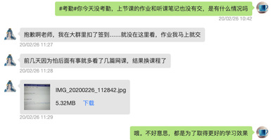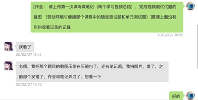 正式上课的时候,我要求每个同学都来签到,争取在课堂的时间观看视频,并做听课笔记,为了更好的让同学们认真观看视频,每节课都会准备10个左右的思考题,有些是比较识记性的答案,有些需要同学们进行归纳总结后回答的。有些同学在之前就看过一部分视频,所以很快的就提交了作业,而且非常认真。有的同学在交作业的时候还不忘给老师留言,我的努力同学们也都感觉的到,这让我感觉很温暖。上课的时间我都会告诉同学们在学习的时候有问题随时可以和我交流。这个时候课堂派的功能就比较好,能够实时互动,同学们可以发私信给我,每节课我也会准备一个话题,让同学们结合本节课的内容发表自己的观点,同学们都很踊跃。