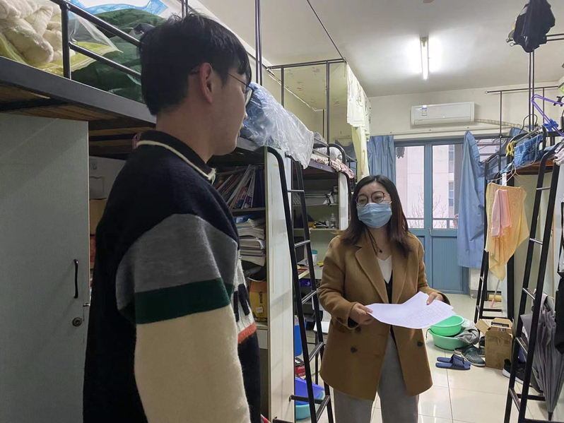 杨敏与同学们亲切交流,关心了解同学们的生活状况,期末复习情况,考研意向和准备情况。走访过程中,杨敏亲切地叮嘱同学们遇到困难要及时与辅导员沟通交流,合理规划好学习时间,增强宿舍安全防范意识,共创安全、文明、整洁、和谐的宿舍环境,形成优良的宿舍文化。