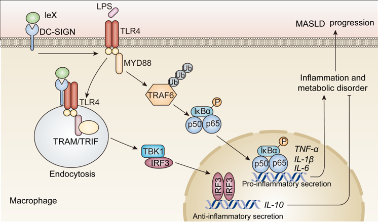 机制研究层面,团队证实DC-SIGN 与关键促炎免疫受体 TLR4 存在直接相互作用。DC-SIGN 可促进活化的 TLR4 内噬,进而选择性抑制 TLR4 介导的 MyD88 促炎信号通路及炎症因子表达,同时增强下游 TBK1/IRF3 抑炎通路及抑炎因子表达,最终实现对巨噬细胞极化和炎症反应的调控。