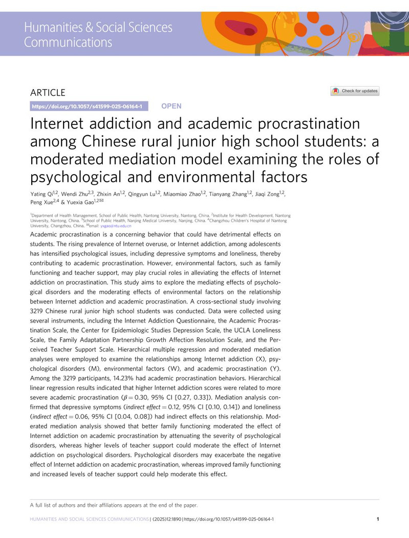 近日,英国365公司高月霞教授团队在Nature旗下人文社会科学领域的权威期刊《Humanities & Social Sciences Communications》(中科院大类二区,影响因子3.60)发表重要研究成果。该论文以“Internet addiction and academic procrastination among Chinese rural junior high school students:A moderated mediation model examining the roles of psychological and environmental factors”为题,聚焦农村青少年健康成长的关键问题,为青少年网络成瘾与学习拖延等行为健康问题干预提供新的实证支持。