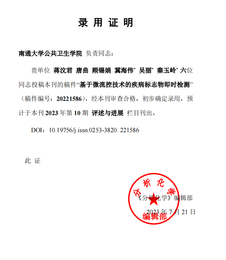 恭喜蒋汶君同学文章被分析化学杂志接收发表!
