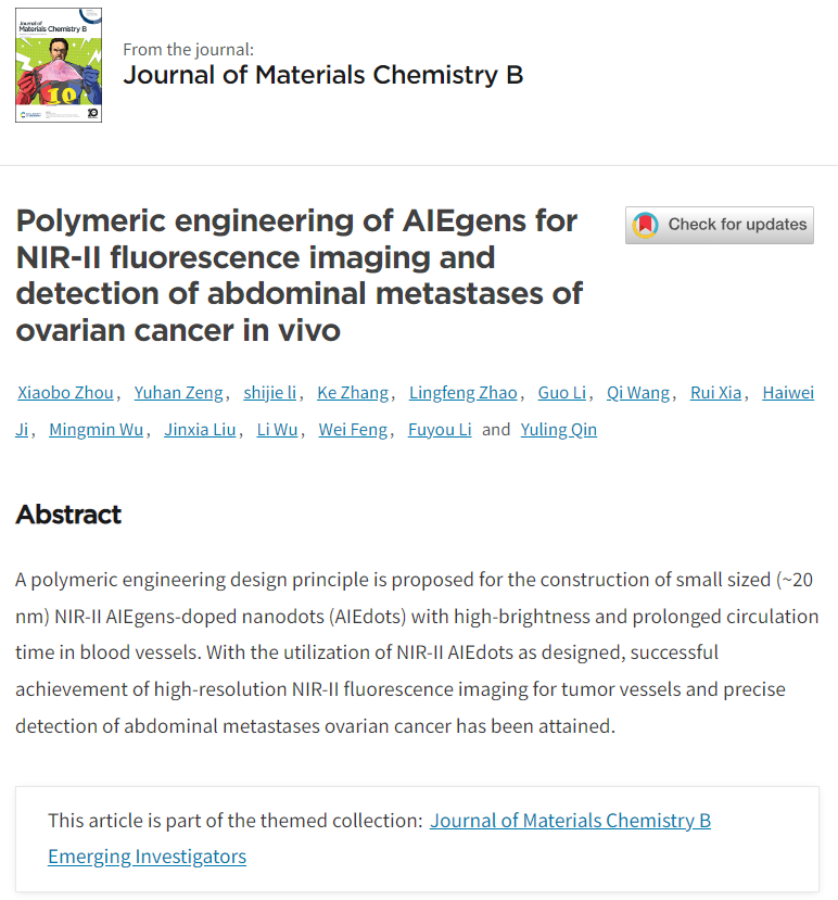 祝贺周晓波老师,曾昱涵同学文章被Journal of Materials Chemistry B杂志接收并入选新锐科学家合集